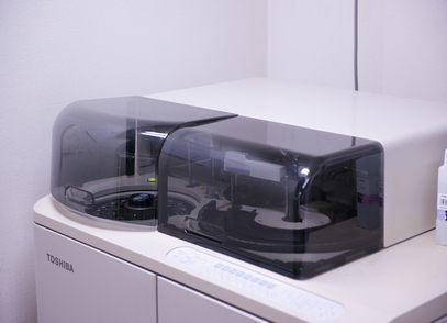 生化学自動分析装置は、血液が固まった時に上澄みとしてできる淡黄色の液体成分(血清)や尿を検体とし、試薬と反応させ、糖やコレステロール、タンパク、酵素などの各種成分の測定を行う装置です。