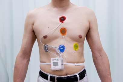 24時間の日常生活中の心電図を記録します。一過性におこる不整脈の検出を行うものです。