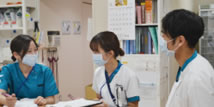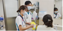 点滴の準備・確認・患者さんをデイルームへ誘導 先輩看護師と一緒に点滴の更新の準備や注射薬を準備し、 先輩看護師や看護補助者と協力し、患者さんをデイルームに誘導します。 |